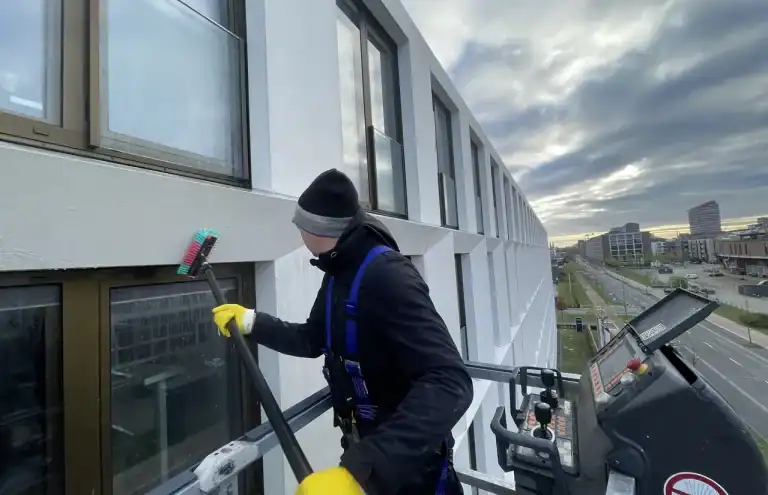 In der Bremer Überseestadt wurde eine 20 Meter hohe Betonfassade mithilfe eines 35-Meter-Steigers gründlich gereinigt. Spezielle Reiniger gewährleisteten die sichere und effektive Entfernung von Schmutz und Ablagerungen. Dank der abschließenden Hydrophobierung bleibt die Fassade dauerhaft vor äußeren Einflüssen geschützt und behält ihre hochwertige Optik.